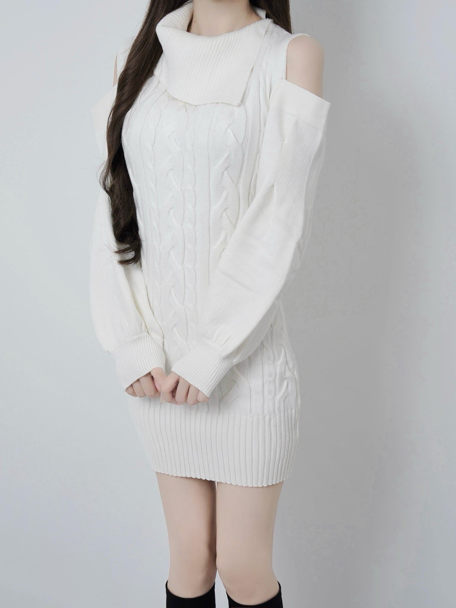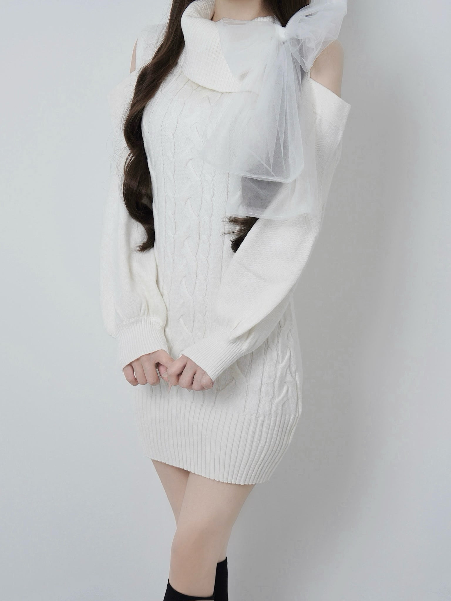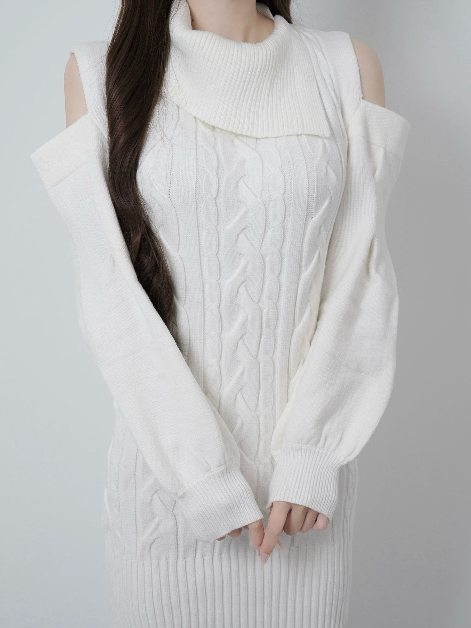 美シルエットのケーブル編みニットは